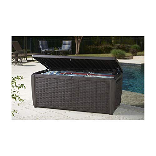 Tidy up your patio, deck and yard in style with this gorgeous, all-weather Sumatra deck box by Keter. Because it’s made out of Keter plastic, a high-quality polypropylene resin, it is capable of withstanding just about anything without peeling, denting, rusting or otherwise becoming damaged. Its 135-gallon capacity makes it roomy enough to store everything from large patio furniture cushions to garden tools, pool supplies and more. As an added bonus, it is strong enough to improve up to 770 pounds, so it doubles as an attractive outdoor bench as well. Get organized with a stylish plastic deck box. Tired of dealing with a cluttered yard, deck or patio? It’s all too easy for kids’ toys, garden tools, pool supplies and other odds and ends to get out of hand. What you want is a reliable, easy-to-use outdoor storage solution, and this elegant box by Keter should fill the bill nicely. You’ll be able to store just about anything in it and feel confident that it is going to stay protected all the whilst. The box keeps stored items dry, and tiny holes keep them ventilated too. Therefore, you don’t have to worry about opening the box to musty odors or other unpleasant surprises. Safe, secure outdoor storage. All too continuously, all-weather storage boxes don’t include security features of any kinds. Luckily, that’s not the case with this attractive plastic box. It has a loop that can be used at the side of a padlock to securely lock up items when they are not in use. In addition to being lockable, this box has a hinged lid that features an auto-opening mechanism for convenience. Just start lifting the lid, and it is going to automatically open the rest of the way on its own. This box is UV- and weather-resistant, so there is no need to store it away right through the winter or to worry about it becoming faded in the hot, summer sunshine. Features & Benefits: Assembled dimensions: 57 in. L x 28. 7 in. W x 25 in. H Internal dimensions: 54 in. L x 26 in. W x 22 in. H Style: Elegant rattan-look appearance Storage capacity: 135 Gal. Large storage capacity, ideal for cushions, outdoor toys, garden and pool supplies Weight capacity: 770 lbs. Comfortably seats two adults, doubling as a garden seating solution Lid designed with pistons so that it opens easily and automatically Built-in handles for easier portability Vented for air circulation Lockable design for enhanced security (lock not included) Constructed with all-weather polypropylene resin plastic that will never chip, peel, rot or rust