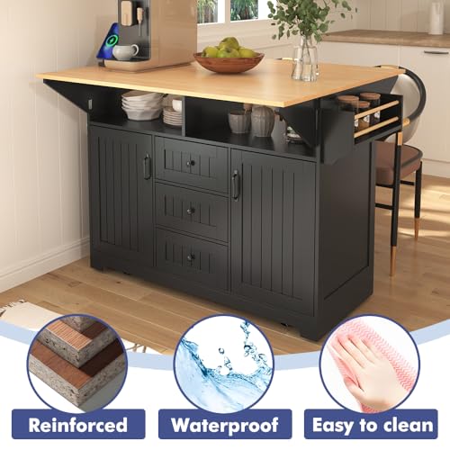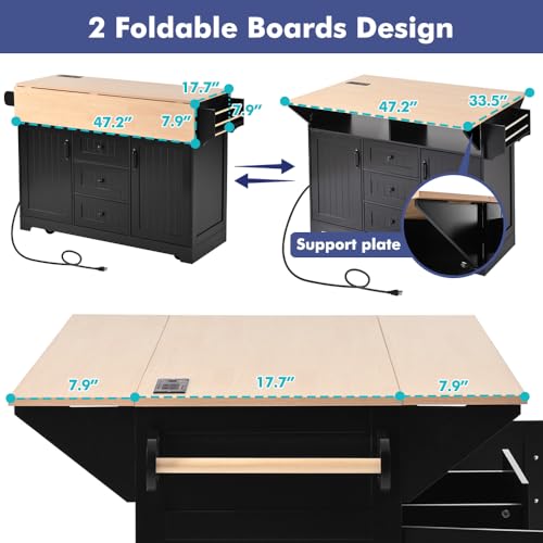 [DUAL FOLDING MULTIFUNCTIONAL ISLAND] This spacious kitchen island features a versatile double-sided folding design, making an allowance for seamless transitions between dining table, kitchen island, or workstation configurations as needed. It also has 4 strong drop leaf supports, which can give a boost to to accommodate two extended table plates. This kitchen island cart offers the convenience of easy folding whilst also serving as a dining table for 4 or a side table for 2-3.