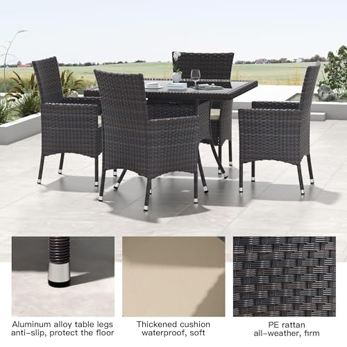 • Kullavik 5 Piece Outdoor Dining Set Patio Rattan Furniture SetPatio Dining Table and Chairs Set with 4 Chairs and CushionsSquare Glass Tabletop with Umbrella Hole for PatioBackyardGardenSand