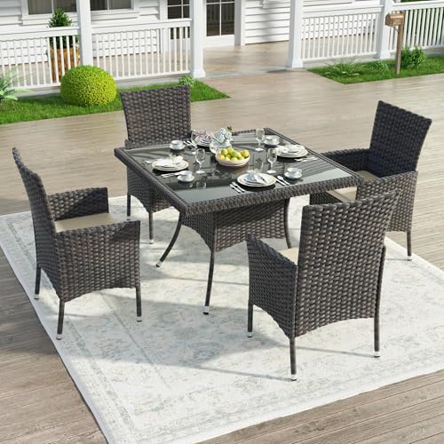 Kullavik 5-Piece Outdoor Dining Set Patio Rattan Furniture Set,Patio Dining Table and Chairs Set with 4 Chairs and Cushions,Square Glass Tabletop with Umbrella Hole for Patio,Backyard,Garden,Sand