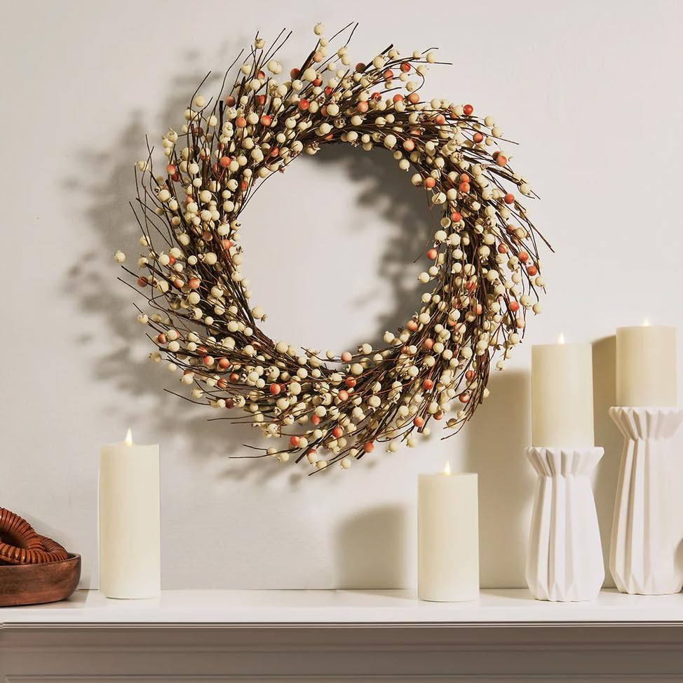 VERSATILE DECOR: The neutral tones of this farmhouse berry wreath are ideal for all-season decor.