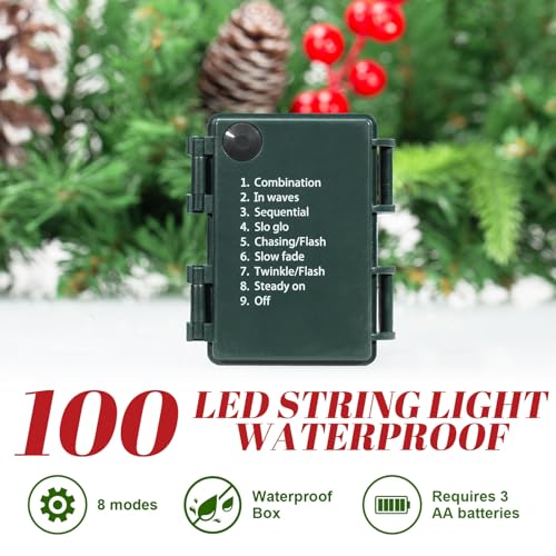 【Pre-Lit Garland】- The garland is pre-lit with 100 warm white LED lightss, equipped with a waterproof battery box, powered by 3 AA batteries (not included). It offers 8 lighting modes to suit different preferences.