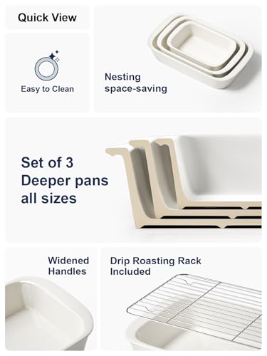 Extra Deep for More Flavor: This 3-piece casserole dishes for oven set includes large (13.7” x 9.6” x 3.0”), medium (11.1” x 8.3” x 2.8”), and small (8.3” x 6.6” x 2.6”) pans. Every pan is deep, making them perfect for all kinds of dishes—from layered casseroles and lasagnas to roasted meats, in addition to circle of relatives-sized or small-batch recipes