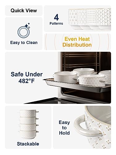 LE TAUCI Soup Bowls with Handles, 20 oz French Onion Soup Crocks, Stackable Soup Bowl Oven Safe for Chili, Beef Stew, Embossment Ceramic Bowl Set – 5.4 Inch, Set of 4, Arctic White