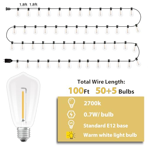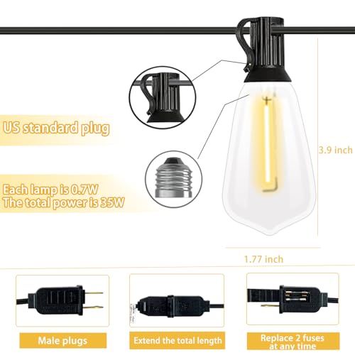 【Warm White Hanging Lights – Dimmable】- With 2700K Lights and E12 bulbs, that may be dimmed, Use the 100ft ST38 outdoor string lights will create an impressively-comfortable, homey atmosphere that is not too lightness or too dark. They are a great choice for creating your own outdoor The holy Land, where You’ll be able to enjoy your time after a busy day or enjoy a cozy party atmosphere with your friends