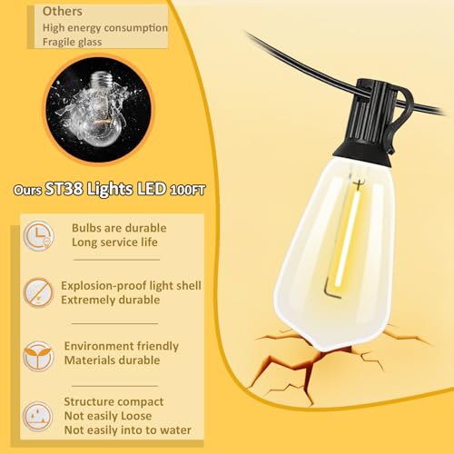 • LED Outdoor String Lights 100Ft Waterproof Patio Lights with 55 Shatterproof ST38 Dimmable Edison Bulbs Dimmable Outdoor String Lights led for Porch Deck Garden Backyard Balcony Xmas 2700K