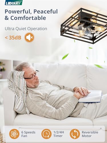 Easy to Assemble: The components of the caged ceiling fan are pre-assembled, you just want to mount it onto the ceiling. Refer to the main points page or manual for self-installation, it takes less than 5 minutes, saving you from additional expenses for an electrician. The black ceiling fan is compatible with E26 bulbs (Bulbs not included). You are free to select any light bulb with a different color temperature or brightness to create the ambiance you wish to have