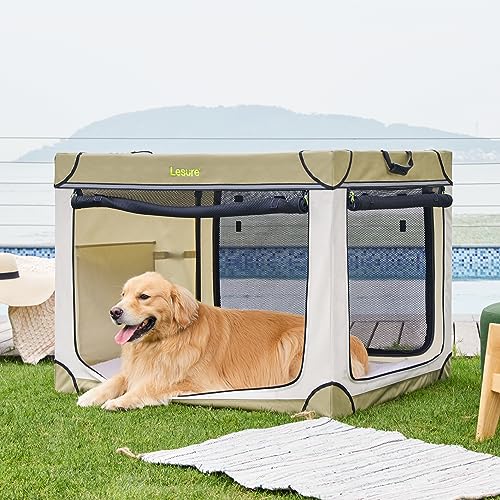 • Lesure Soft Collapsible Dog Crate 42 Inch Portable Travel Crate for Extra Large Dogs Indoor Outdoor 4 Door Foldable Pet Kennel with Durable Mesh Windows Beige