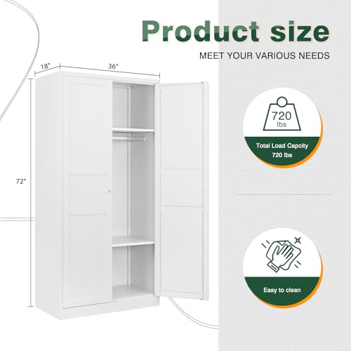 Spacious and Flexible Storage: 72H×36W×18D. This tall wardrobe has a large interior with a dedicated hanging rod area and adjustable shelves. The large storage capacity permits you to organise clothes, accessories, office supplies and more, increasing the functionality and flexibility of your space.