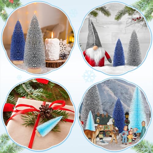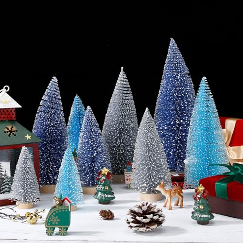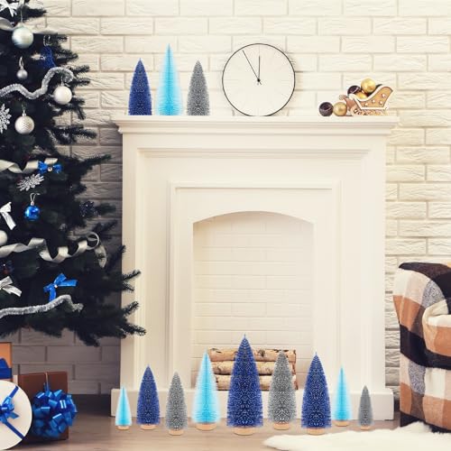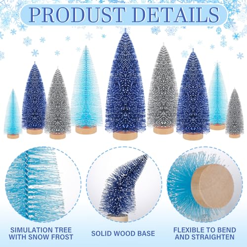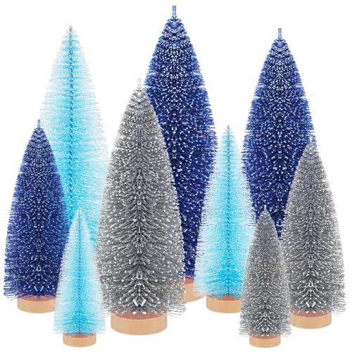 • Leyndo 9 Pcs Blue Color Mini Sisal Bottle Brush Trees Small Artificial Christmas Tree with Wood Base Christmas Pine Trees for Winter Home Table Party Decor