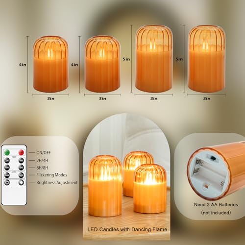 Lezonic Glass Flameless Candles Battery Operated with Remote, Dancing Flame LED Flickering Flameless Pillar Candles, Set of 4 Real Wax Fall Decorations for Home, H: 4″ 4″ 5″ 5″(Pumpkin Orange)
