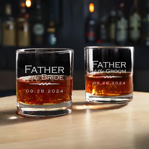 Customized father of the groom whiskey glass: click “customize now” to have their name, wedding role, and wedding date laser engraved on the glass in the design as shown