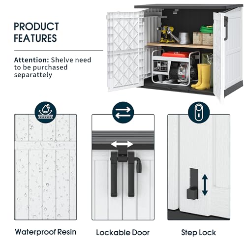 DOUBLE LOCKING DESIGN – The top of the cabinet is pre-drilled with locking holes, and the bottom latch can be utilized for foot switches without the wish to crouch down. Two locks ensure your items are protected and intact outdoors. Lever-supported flap facilitates quick and easy storage of your items.