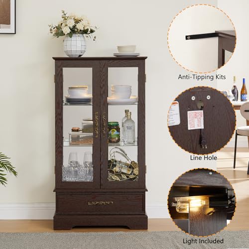 Lighted Glass Cabinet Curio Display Cabinet with Adjustable Glass Shelves 2 Doors and 1 Drawer Farmhouse Buffet Sideboard, Bulb Included