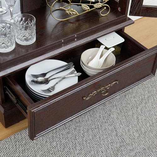Unfashionable style Glass cabinet: Crafted with curved legs 、a big drawer and metal handles, this cabinet exudes a touch of classical beauty and vintage charm. Its timeless style allows it to seamlessly fit into any corner, bringing an eternal sense of elegance to your space.