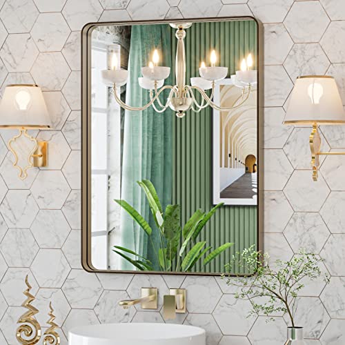 • LOAAO 22X30 Bronze Bathroom Mirrors for Vanity Rounded Rectangle Brushed Bronze Metal Frame Mirror Anti Rust Tempered Glass Hangs Horizontally or Vertically