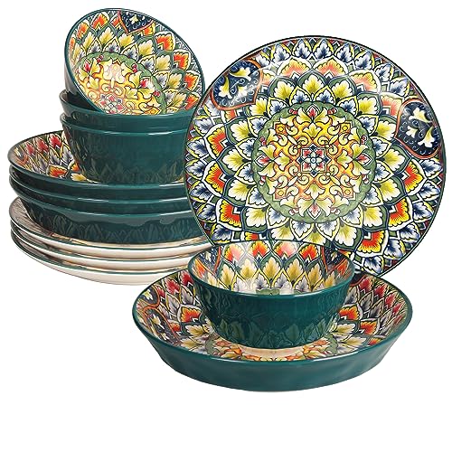 • Mandala Dinnerware Sets 12 Pcs Serves 4 Buffet Dinnerware Boho Plates and Bowls Dish Set with 8 salad Plate 8 Dessert Plate 48 bowl apply Casual dining Indoor Outdoor Dining Party