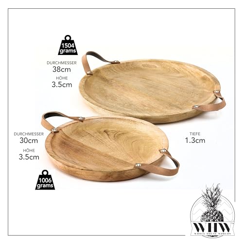 Entertain and be merry with improbable presentations of drinks or appetizers with Mango Wood Board Servers, Set of 2, These food protected serving boards are chunky, up to date, rustic and round. Handcrafted of durable and responsibly harvested solid mango wood, each board has handles made of leather strips that are approx. 1/2 inch thick. Attached to the boards by shiny silver metal studs, the bottom of side each leather take care of is smooth to the touch black whilst the tops are finished in brown suede. Generously sized, each tray in the set is 15 and 12 inches in diameter. Create stunning displays and showcase foods or table top displays with unbelievable modern farmhouse style. Beautifully finished and gorgeously grained, each tray is made by hand and will exhibit its own unique patterns and color variations. Maintain these trays by hand washing and towel drying. Rub with food protected oil to take care of a rich color. (Do not put in dishwasher.) Versatile, these serving boards are by nature cutting boards as well. Prepare recipe ingredients, serve cheeses, cut grilled meats or veggies. A welcome hostess gift for every occasion. Welcome to the product line of Whole House Worlds. The New York based company offers top of the range, stylish products for every room in the house, and beyond. From the kitchen, to the lounge, to the bedroom, dining room, home office, closet and garden: Our criteria are comfort, quality, style and value.