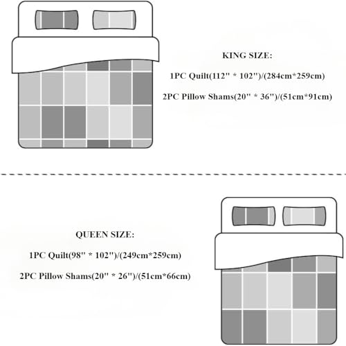Package Come with:QUEEN SIZE: 1PC Quilt(98″ X 102″) ,2PC Pillow Shams(20″ X 26″) OR KING SIZE: 1PC Quilt(112″ X 102″) ,v2PC Pillow Shams(20″ X 36″)