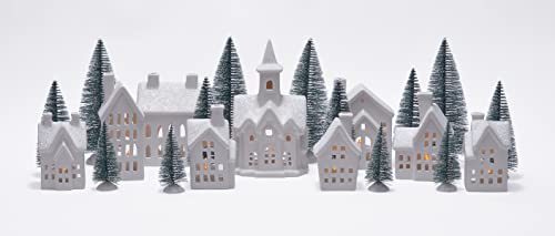 Set includes (13) sisal trees, (9) village buildings, and (9) battery-operated tea lighting fixtures; Every piece is manufactured from unglazed porcelain subject material with glitter accents
