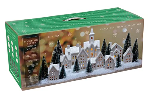 Mark Feldstein & Associates Winter Village LED Tea Light 31 Piece Porcelain Tabletop Christmas Figurine Boxed Set