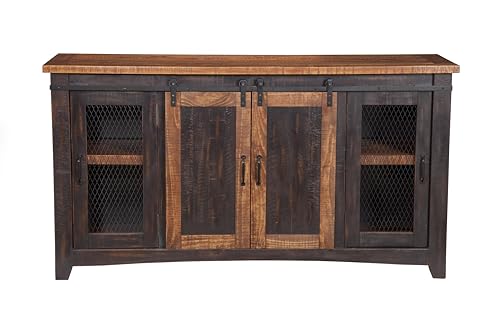 RUSTIC DESIGN WITH A MODERN TWIST – Crafted from solid pine wood and pine veneers, this 65″ TV stand boasts a natural distressed finish that blends effortlessly with rustic, farmhouse, or industrial décor. Metal mesh-style doors add the easiest touch of rustic charm. Ever versatile, this piece doubles as a dining room server, credenza, or sideboard.