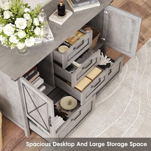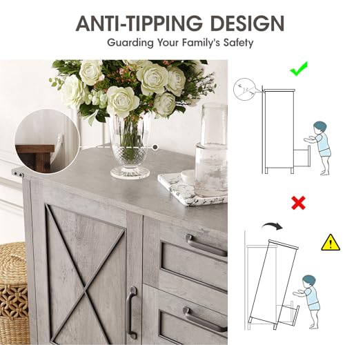 FARMHOUSE CABINET WITH STORAGE: The buffet cabinet sideboards come with extra large storage space: a spacious table top, 2 large cabinets and 5 wide drawers. It also combines farmhouse and brand new style perfectly, suitable for kitchen, living room, dining room and so forth. The gray cabinet size is 47.24”L x15.75”W x31.5”H.