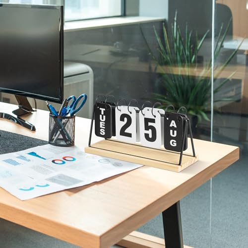 • Metal Desk Calendar Standing Flip with Wooden Base Daily Perpetual Flip Calendar with Large Display Modern Farmhouse Desktop Calendar for Home Office Decor Reusable and Foldable