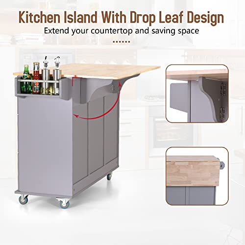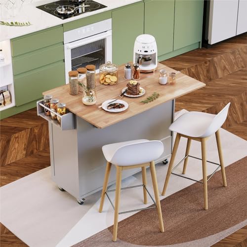 Rolling Kitchen Island with Drop Leaf – Drop leaf design can extend your countertop and saving space when fold. When the drop leaf expanded, you’ll be able to prepare dishes more freely on a large kitchen island table and also can enjoy meals at the table. Foldable countertop is made of varnished and high-quality rubberwood which is elegant, easy to clean and durable