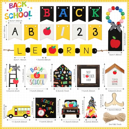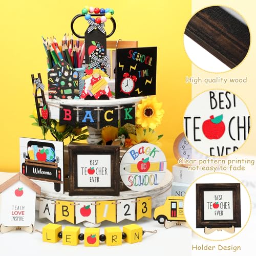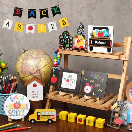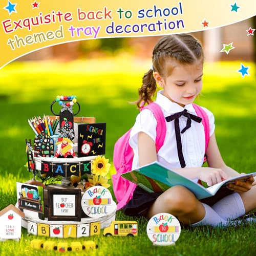 Ideal Back to School Decorations: these tray decorations have many classic elements, such as hot school bus, school, ruler and more, creating a joyful atmosphere in your house with these delightful tiered tray decors