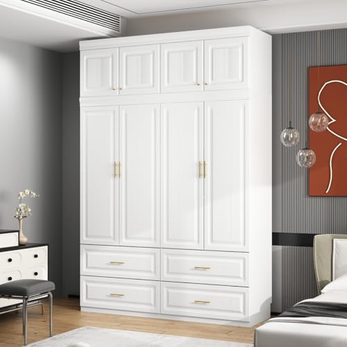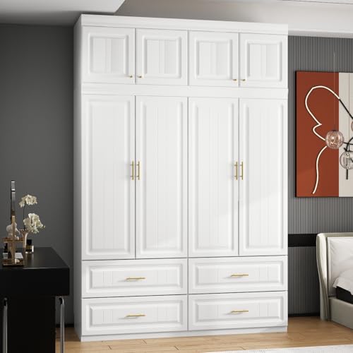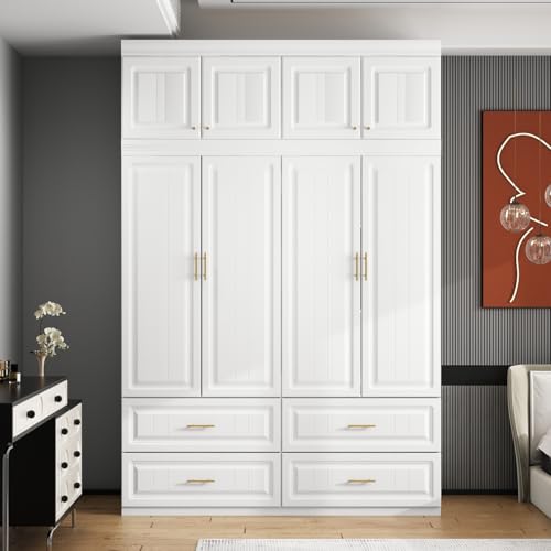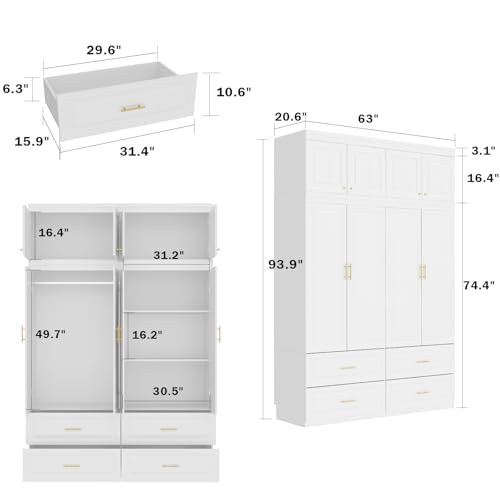 MOUMON 4 Door Wardrobe Closet with Drawers & Shelves, Armoire Wardrobe Closet with Hanging Rod, Wardrobe Cabinet with Gold Metal Handles, Top Cube Storage, White (63”W x 20.6”D x 93.9”H)