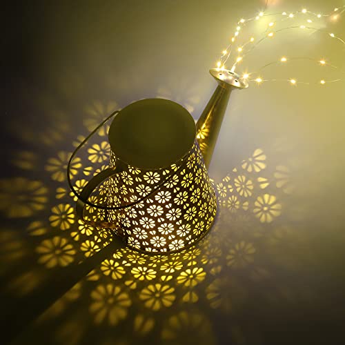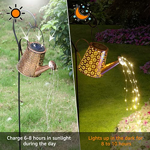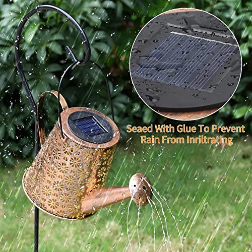Outdoor solar lantern has a unique and decorative design, can be hung on the porch, tree, or pergola with a hanging ring, or placed on the table or ledge to display a vivid and pretty retro hollow pattern, add a warm and pleasant ambience to your yard and deck.Copper wire LED lights can be easily bent and shaped into any shape you like. Choose a special spot in your garden or yard to hang the watering can with lights that seem to be pouring water.
