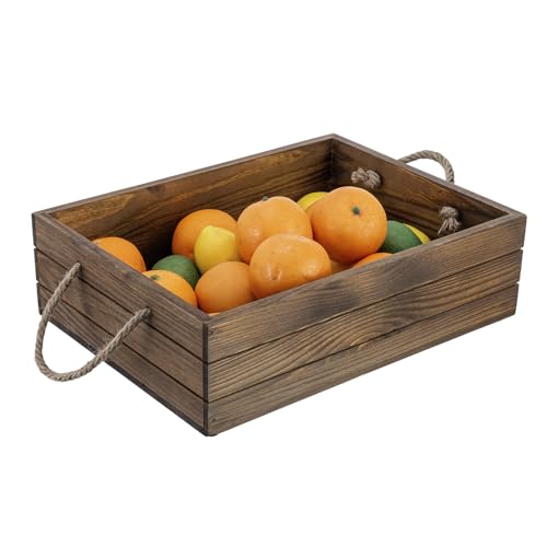 Country farmhouse brown wood pallet style open best bin with rustic rope carrying handles for portable storage and ornamental displays