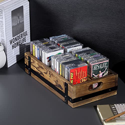 Four compartment wooden audio cassette tape solid wood storage box with rustic burnt wood finish and black metal bracket accents absolute best for organizing your tape collection