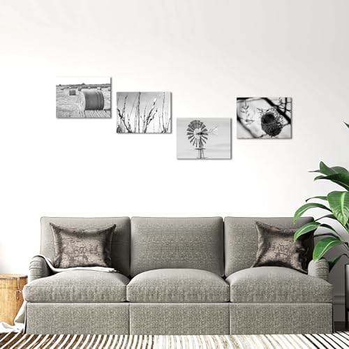 • Nachic Wall 4 Piece Wall Art Black and White Texas Countryside Scenic Pictures Hay Bales Cotton Field Windmill Birds Nest Canvas Art Painting for Farmhouse Wall Decor