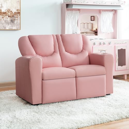 • Naomi home suri kids push back loveseat recliner with cup holders adjustable footrest headrest two seat recliner sofa for boys girls of 3 age pink pvc  urban country home decor
