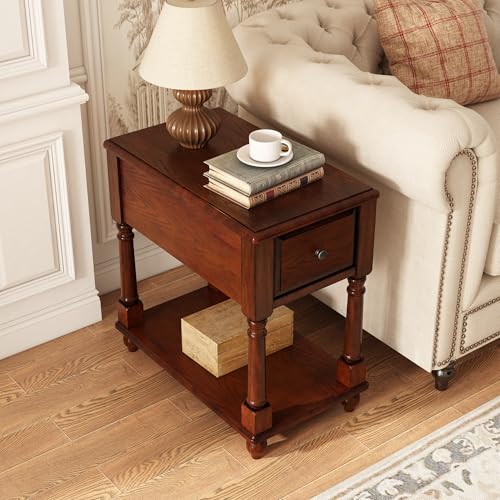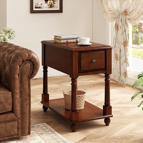 Narrow Open End Table with Drawer, Solid Wood Side Table 2-Tier Skinny Table with Storage Shelves Slim Nightstand Small Sofa End Table for Living Room Bedroom-Cherry Walnut 004DWA