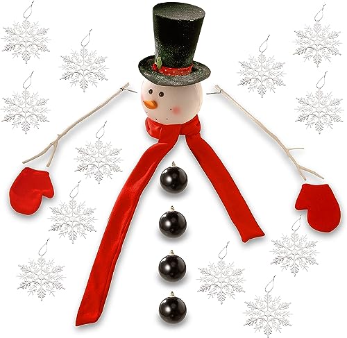 KIT INCLUDES: This Kit has a round poly-foam head with wide smile, a carrot nose sporting, a black top hat, a long red neck scarf, white branch arms with red mittens, four black ball ornaments to serve as buttons and twelve snowflakes for added decoration