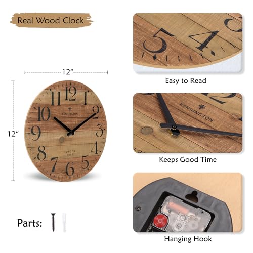 Rustic Farmhouse Style: The clock face has a vintage, distressed wooden design with bold black numbers, capturing a rustic farmhouse or cabin aesthetic.