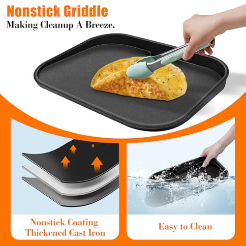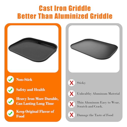 【Heavy Cast Iron Materials】Made from premium cast iron with a thickened bottom, this griddle ensures even heating and excellent heat retention for long-lasting use. Cast iron is more healthy and more durable than aluminum, resistant to warping and deformation. A built-in grease hole efficiently collects waste oil all over cooking for simple maintenance.