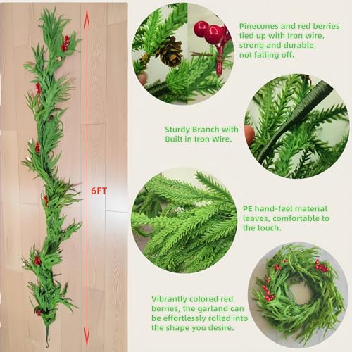 【Perfect Size】Measuring 6 feet in length, our Norfolk Pine garland is the ideal size for adorning staircases and fireplace mantels, creating a charming festive atmosphere