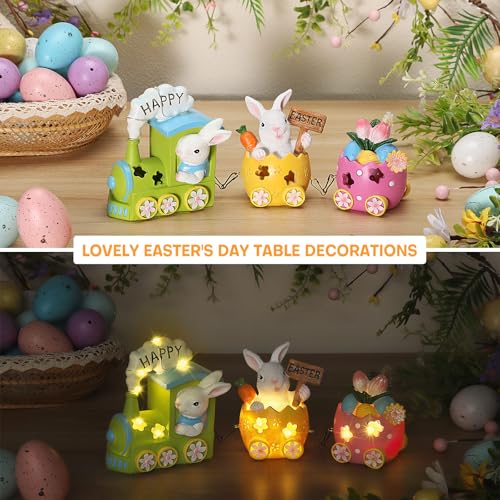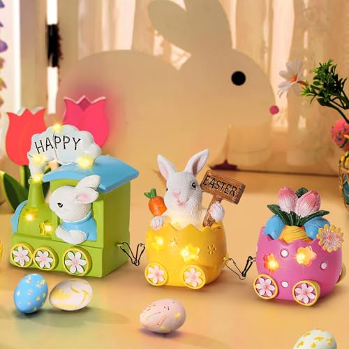 【Funny Design】– It combines the design of a train and 2 bunnies, with a “Happy Easter” sign. The train features a bunny driver and carriages shaped like Easter eggs, decorated with cute bunnies, pink tulips, and mini Easter eggs. They are all painted in different bright colors, giving the figurine a vigorous spring scene. The build-in LED lights are super bright and the hollowed-out design on the train allows the lights to radiate effortlessly, adding a playful and warm atmosphere to home decor