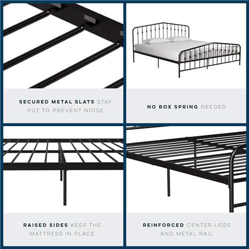 Novogratz Bushwick King Metal Bed, Black, metal slats, side rails and center legs, two base heights – 6″ or 11″ clearance.