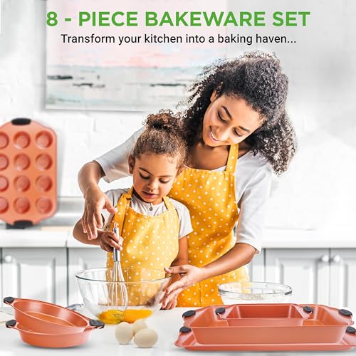 8-PIECE SET: The 8-Piece Baking Pan Set offers complete top quality kitchenware for baking cake, loaf or muffins. Includes baking pan, pizza pan, small cookie sheet, 2 round pans, square pan, loaf pan, 12 cup muffin pans
