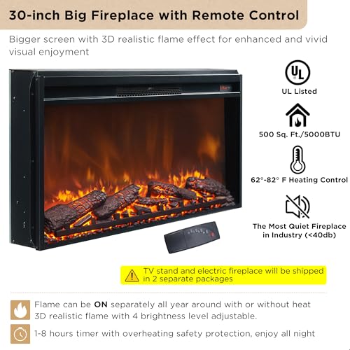 MODERN REALISTIC ELECTRIC FIREPLACE: The built-in 30-inch electric fireplace brings warmth and ambiance to your living space. Realistic dancing flames and burning logs effects create an authentic feel, giving you a real fireplace experience. It comes with a remote regulate for the flame intensity, heater, and turn-off timer. In addition to it may be run with no heat (just flames) in warmer climates.
