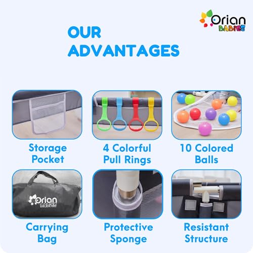 [SPECIAL GIFTS INCLUDED] – The playpens for babies and toddlers package comes with a storage bag (for a quick getaway), four playful pull-rings, a secret storage pocket (for treasures), and ten dazzlingly colorful balls to keep the carnival alive. This toddler playpen / play pin comes in a stylish dark grey color. (No padding at the bottom; you wish to have to shop for an extra baby play mat).