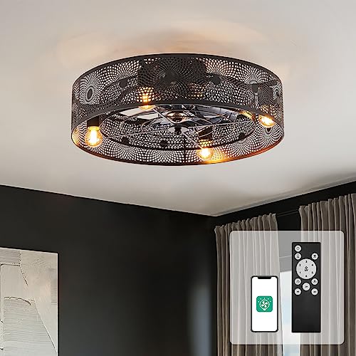 Orison 20 Inch Caged Ceiling Fan with Light, Black, 6 Speeds, Timer, Reversible Motor, Industrial Low Profile Ceiling Fan for Living Room, Bedroom, Kitchen