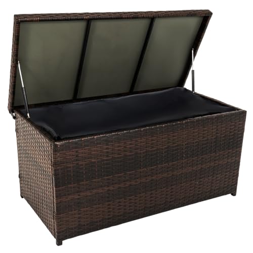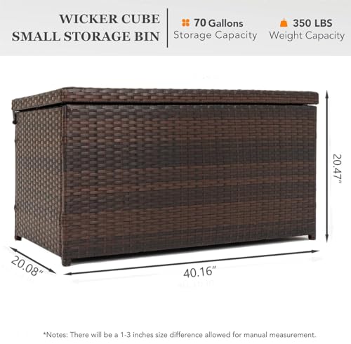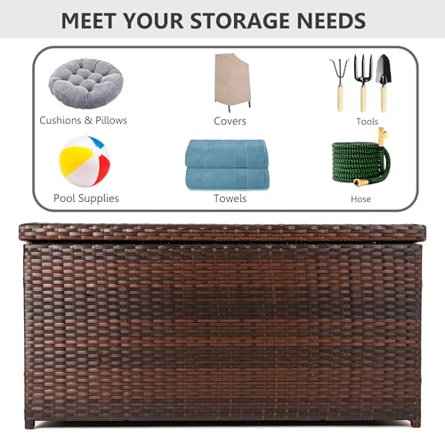• Outdoor 70 Gallon Wicker Storage Box with Waterproof Liner Patio PE Rattan Storage Container for Outside Deck Box with Hinged Lid for Cushions Pillows Towels Horizontal Bin Brown