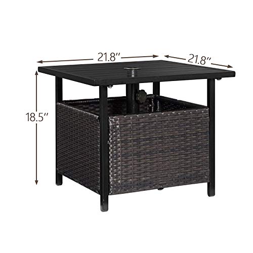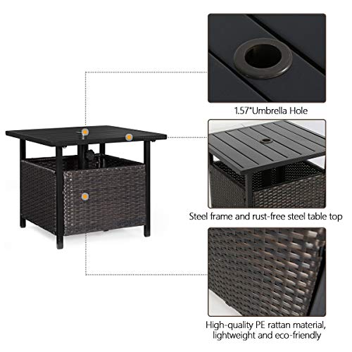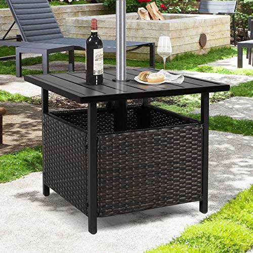 This Peak Home Furnishings umbrella side table & stand is an ideal addition for your patio or deck. Crafted of top quality wicker and stable powder-coated steel frame for long time use. This side table with a 1.57” umbrella hole is suitable for most patio umbrellas, equipped with flatted table top, which is great for afternoon lunch or backyard barbecue, and easy to scrub and take care of.