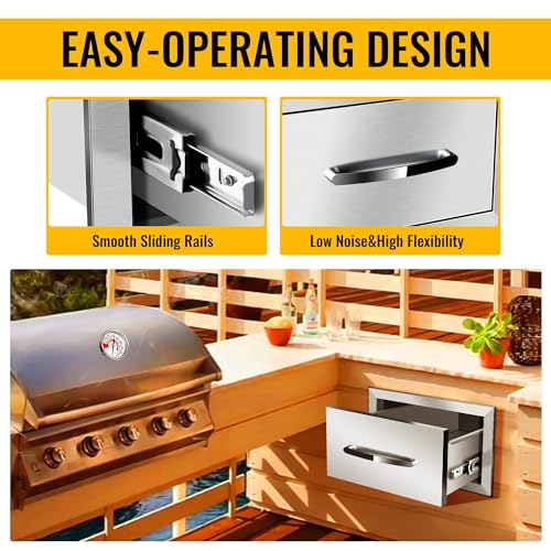 【Versatile Usage】Designed for Out of doors kitchens and BBQ island, As well as, it suitable for quite a lot of weather conditions, our BBQ drawers exhibit remarkable heat resistance and effortless cleaning. The sleek stainless steel body seamlessly complements any setting, adding visual appeal.